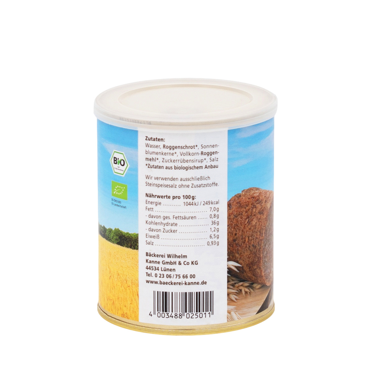 Das kräftige Korn aus der Dose. Ein reines Bio-Vollkorn-Roggenbrot mit ganzen Körnern. Durch die sehr lange Verquellung der Körner und den schonenden langen Backprozess ist es besonders lecker und hat eine lange Frischhaltung. Es hält sich in der Dose bis zu einem Jahr.